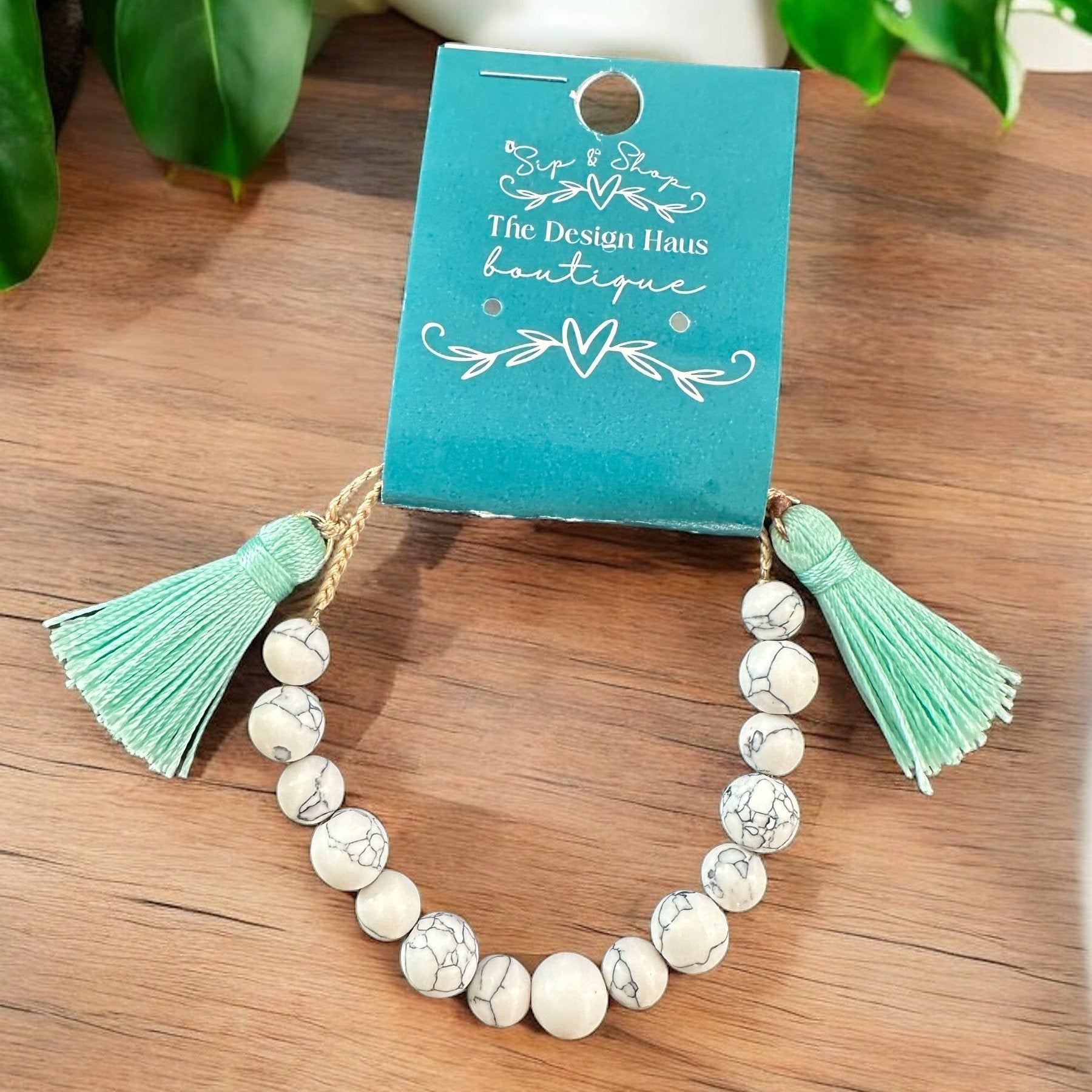 Indulge in the luxurious elegance of our Adjustable Marble Bracelet with Tassels. This exquisite jewelry piece boasts a unique adjustable design, allowing for a perfect fit on any wrist. The striking marble beads add a touch of sophistication, while the tassels add a playful and artistic flair. Elevate your accessory game with this one-of-a-kind bracelet.