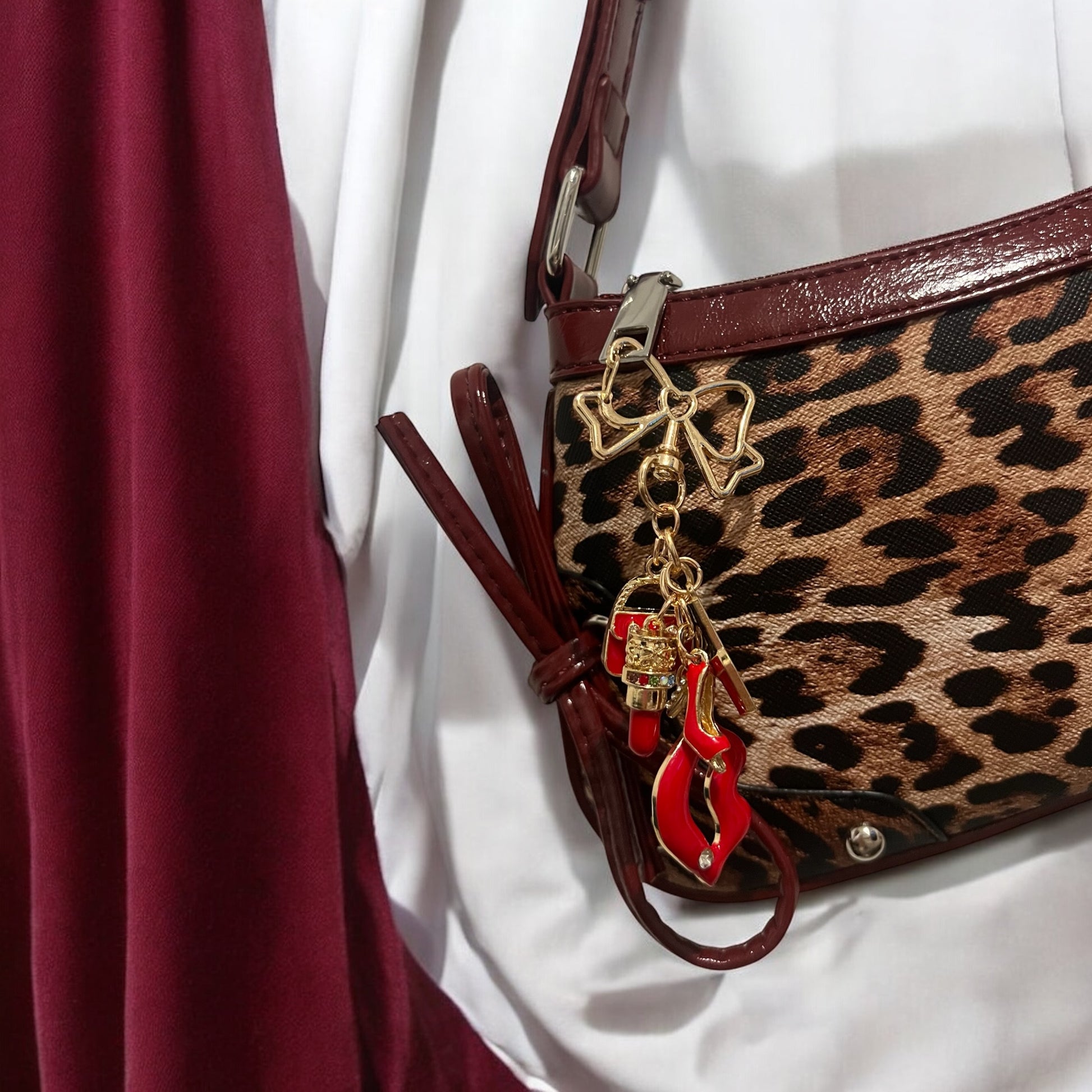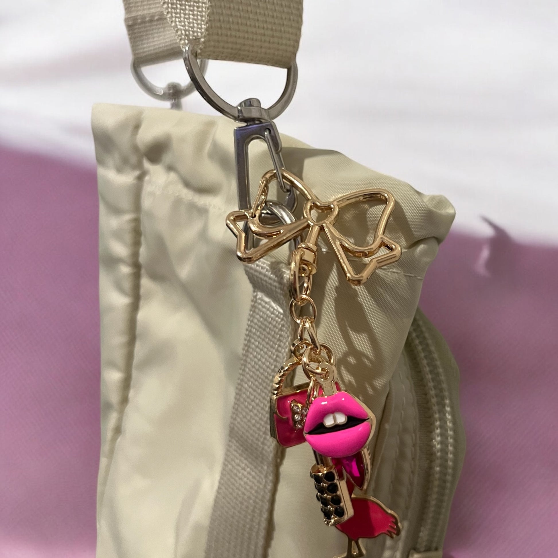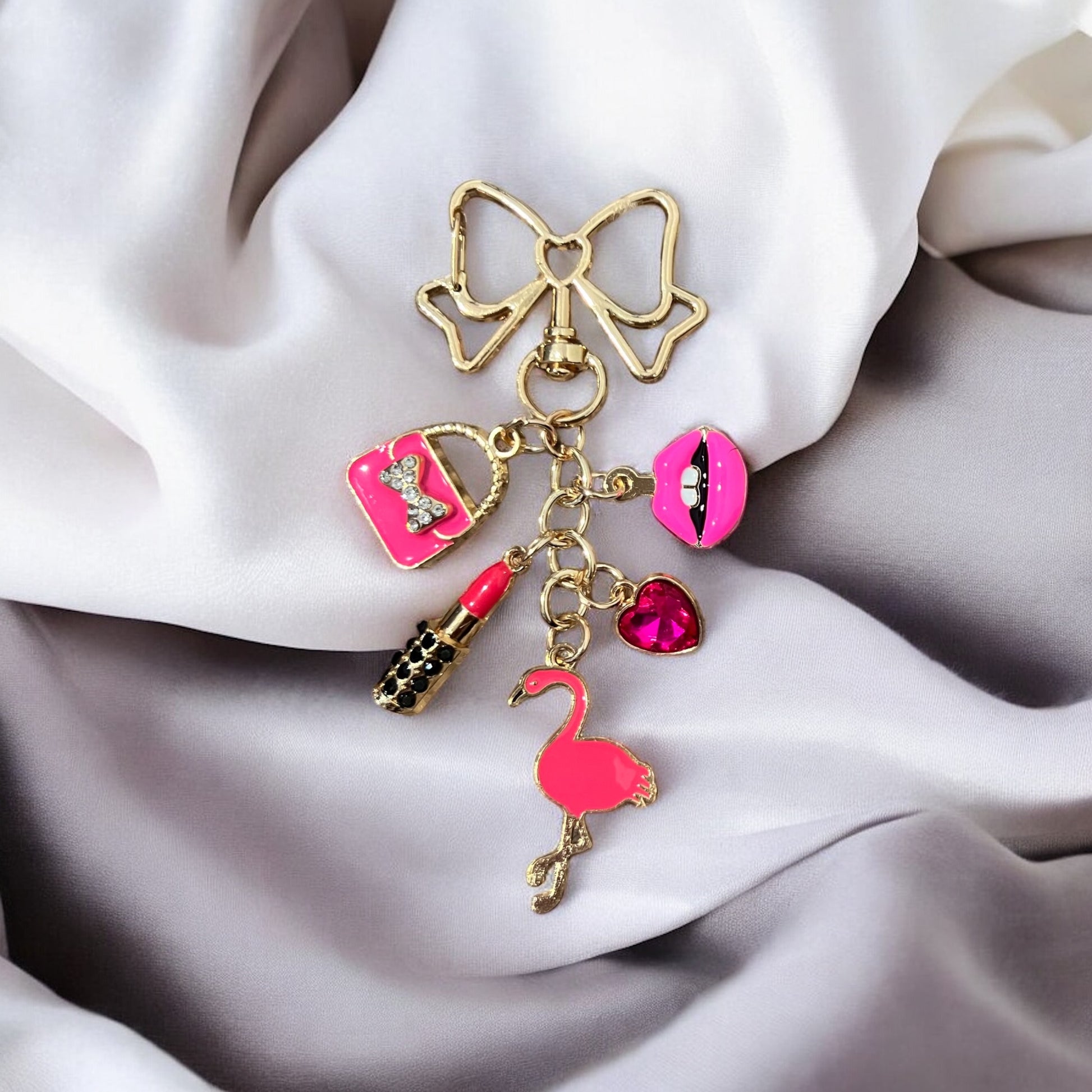 Elevate your style with our Bow Chic Clip on Keychains. This luxurious accessory boasts a purse, high heel, lipstick, lips, and nail polish charm, perfect for accessorizing your purse. Add a touch of sophistication and exclusivity to your look with our premium keychain.