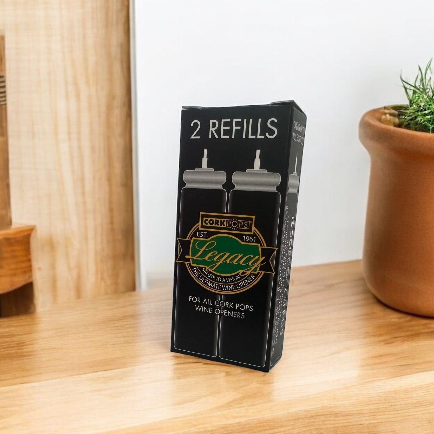 The Legacy Cork Pops Refill Cartridges are packaged two refills per box so you can enjoy your Cork Pops Legacy Wine Opener over and over. Each Cork Pop Refill Cartridge will open approximately 60 - 80 bottles of wine before requiring replacement. The refill cartridges fit all cork pops models, and utilize an environmentally safe, low-pressure inert propellant that does not affect the flavor or bouquet of any wine and has no effect on the atmosphere or ozone layer.
