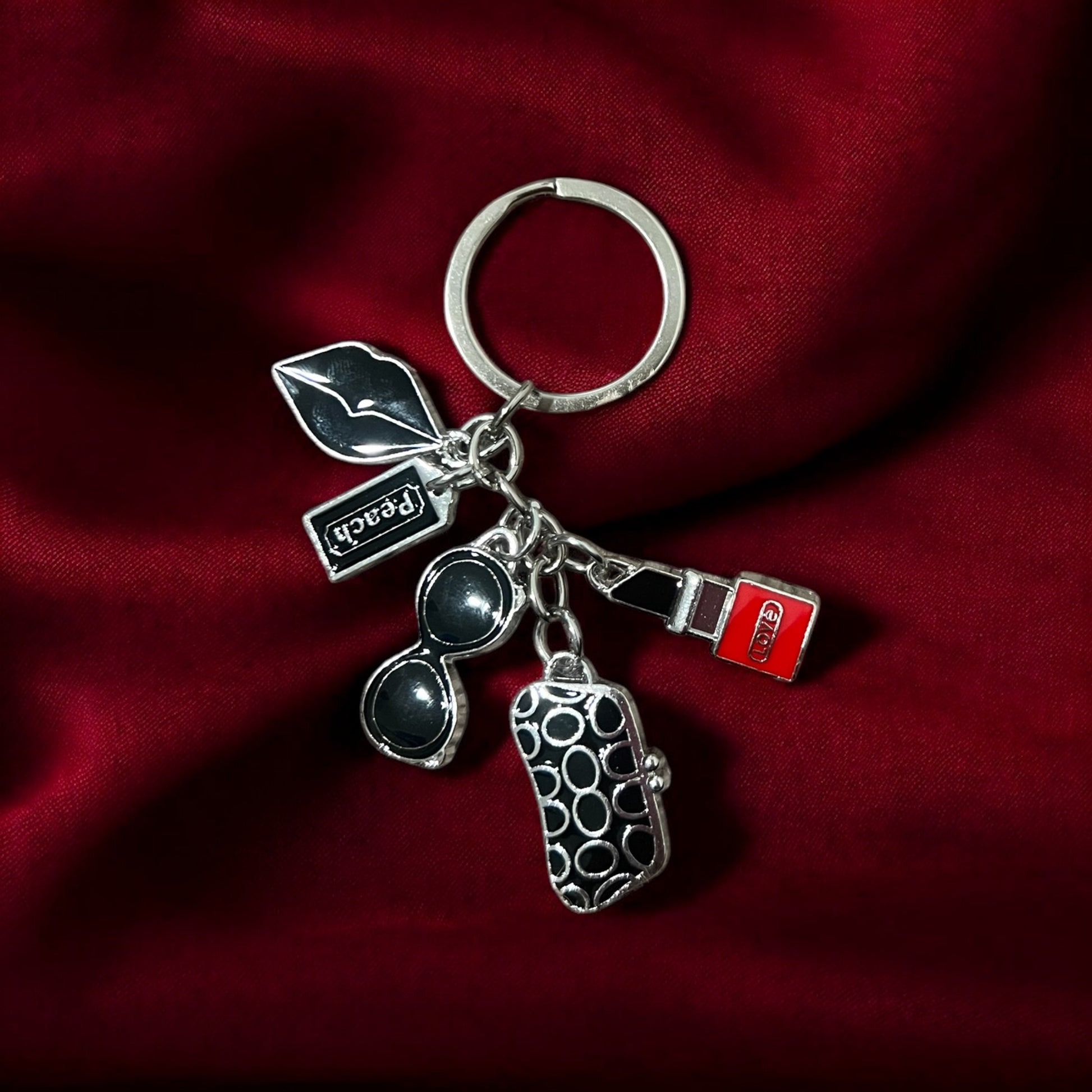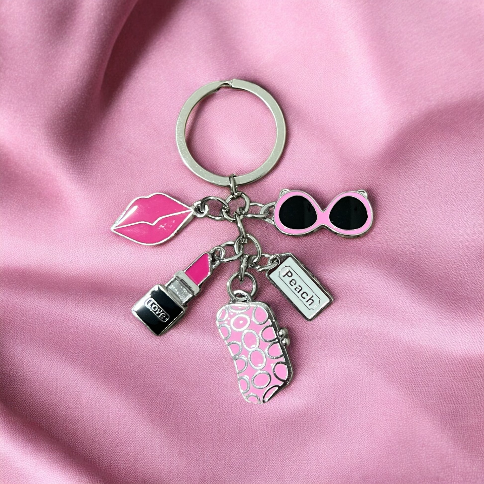 Accessorize in style with this Fashionista Beauty Keychain! Featuring quirky charms like sunglasses, lips, lipstick, and a purse, plus a peach tag for added fun. Can be put on a purse or backpack!