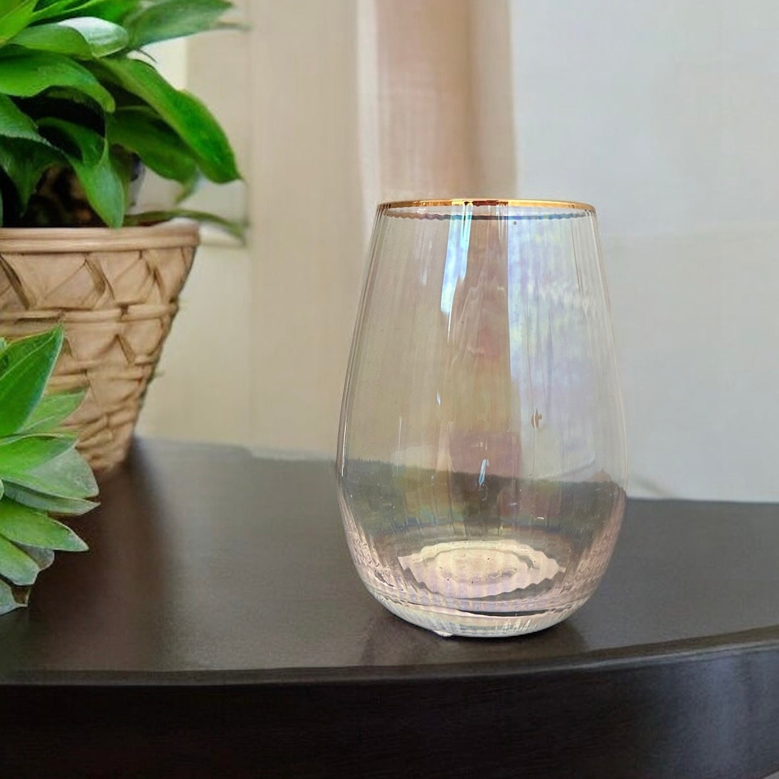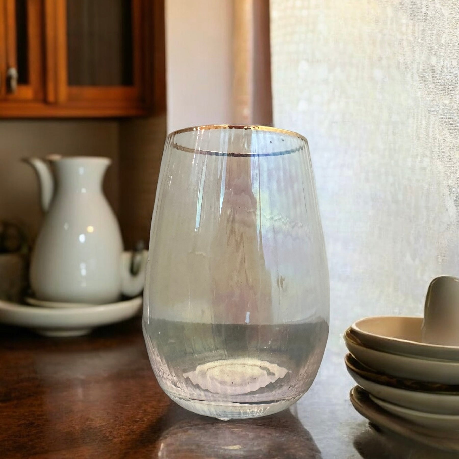 Elevate your wine drinking experience with our stunning Gold Rimmed Wine Glass. The iridescent colored stemless design is both stylish and functional, while the gold rim adds a touch of luxury. Sip your favorite wine in style and make any occasion more special with this beautiful glass!