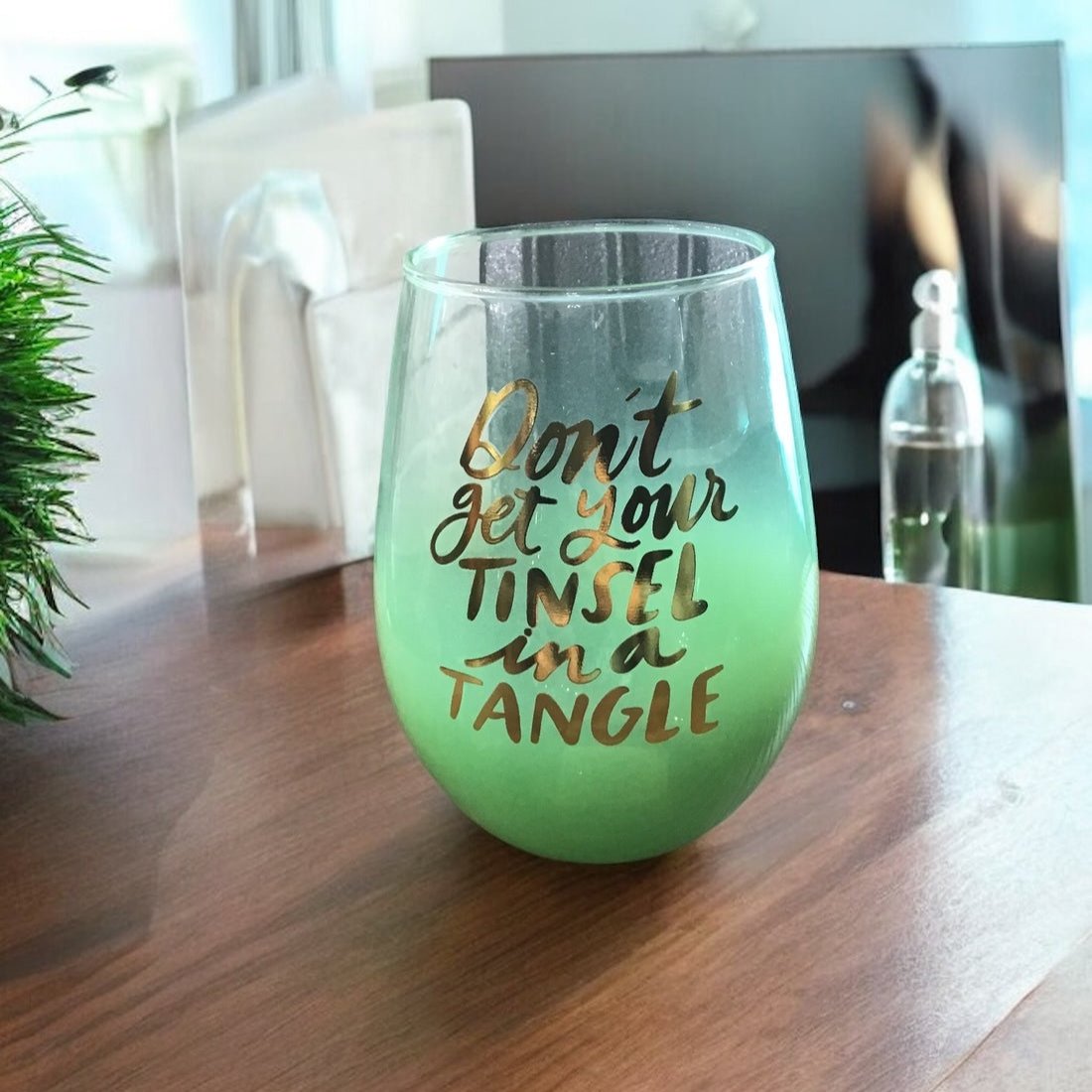Enjoy your favorite beverage in style with this Tinsel Tangle 20oz Wine Glass! It's perfect for adding a touch of bling bling to your favorite cocktails or wine. With its unique, holiday saying “ Don’t get your tinsel tangled “design, this glass will make any occasion infinitely more glamourous.